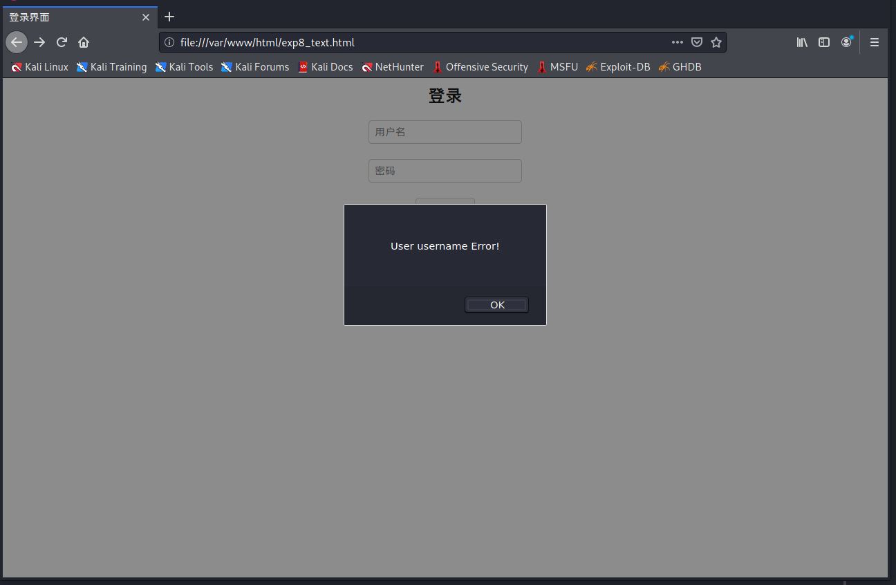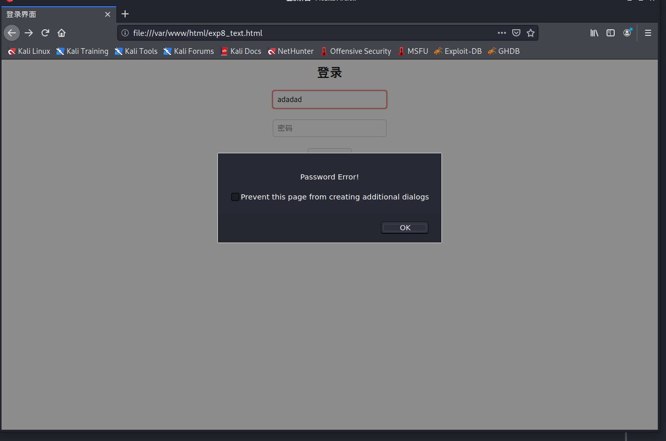 2、在浏览器访问/var/www/html/exp8_text.html,如果用户邮箱或密码未填写就提交,网页会出现以下提示: