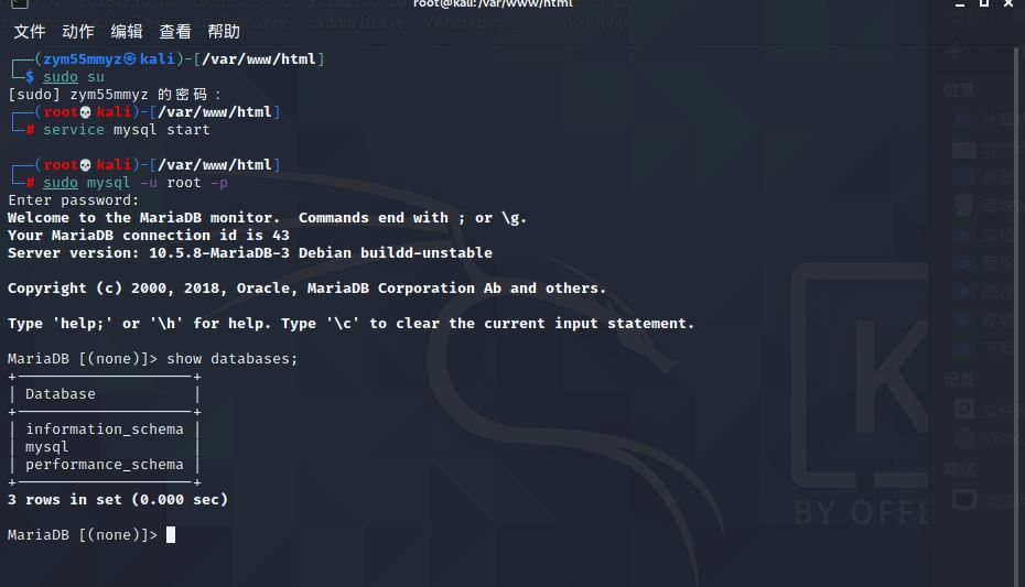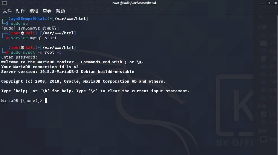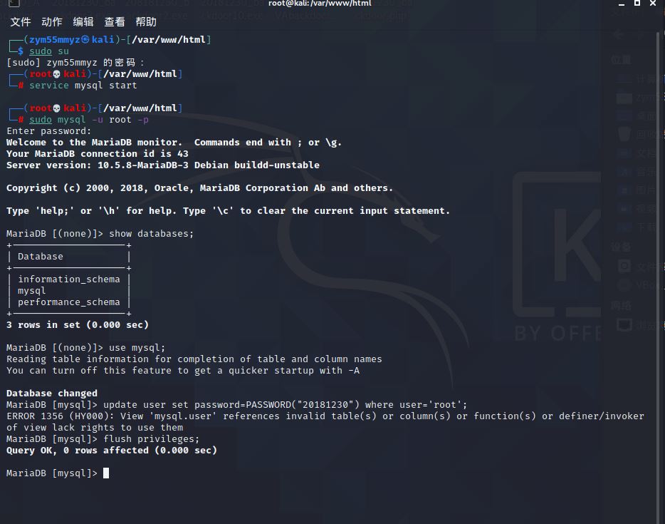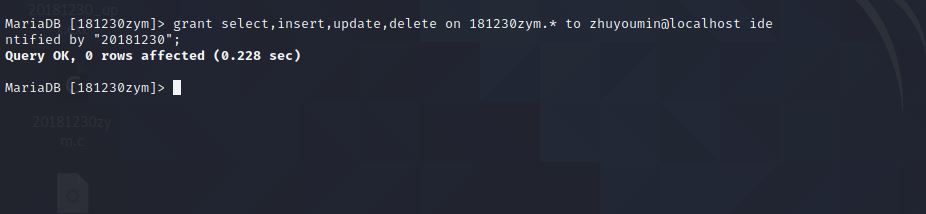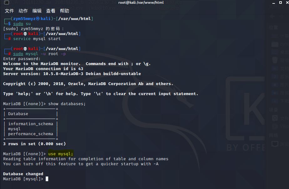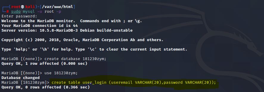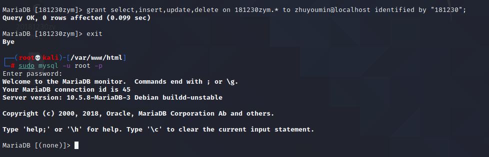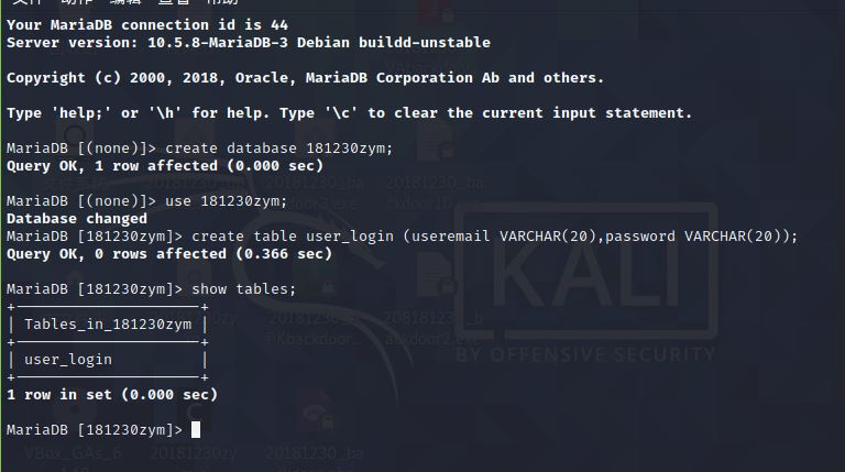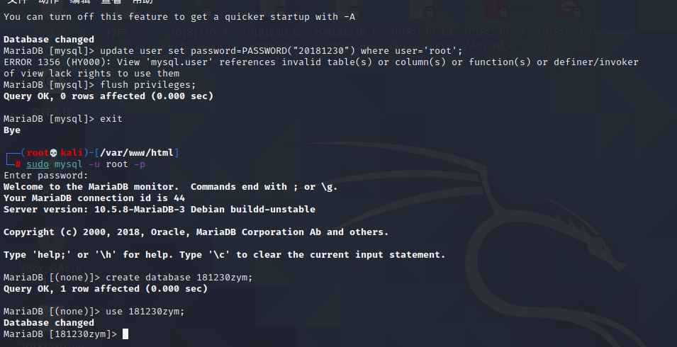 6、exit退出数据库后使用新的密码重新登录,之后使用create database 181230zym;;建立数据库,之后使用use 181230zym;使用我们建立的数据库