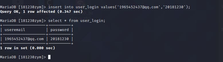 9、使用命令insert into user_login values('1965452437@qq.com','20181230');向表中useremail和password插入数据,即设置登录的email为1965452437@qq.com,登录密码为20181230