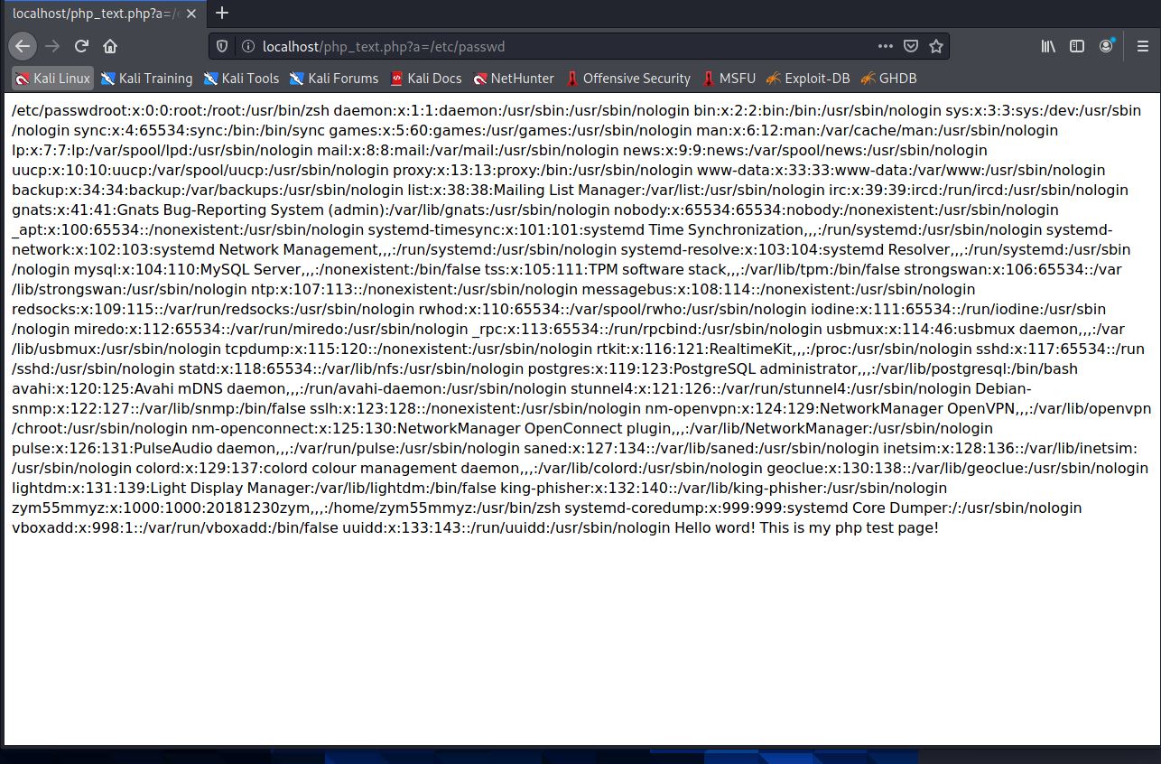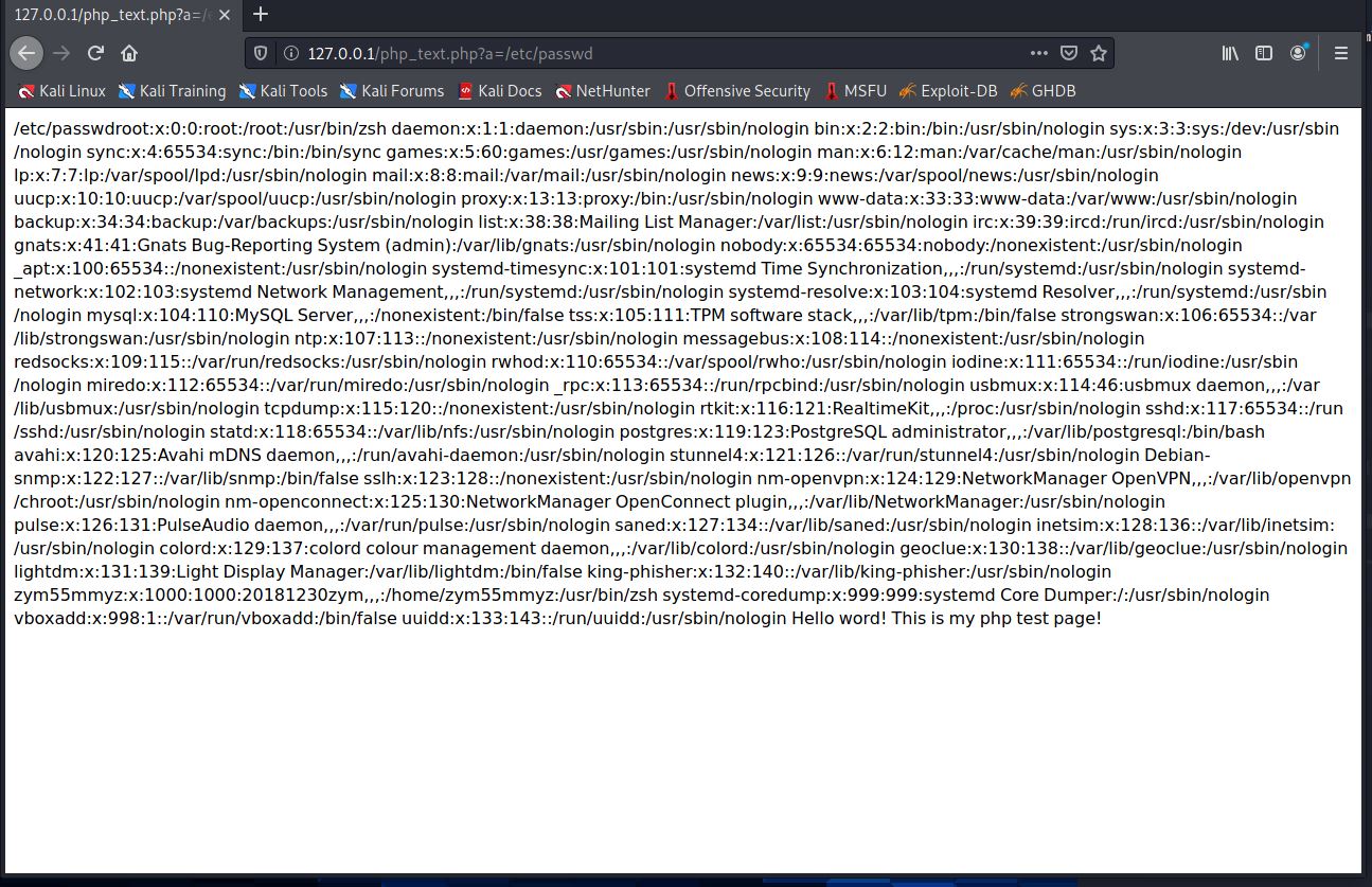 (1)、在浏览器网址栏中输入localhost:80/php_text.php?a=/etc/passwd,可看到/etc/passwd文件的内容: