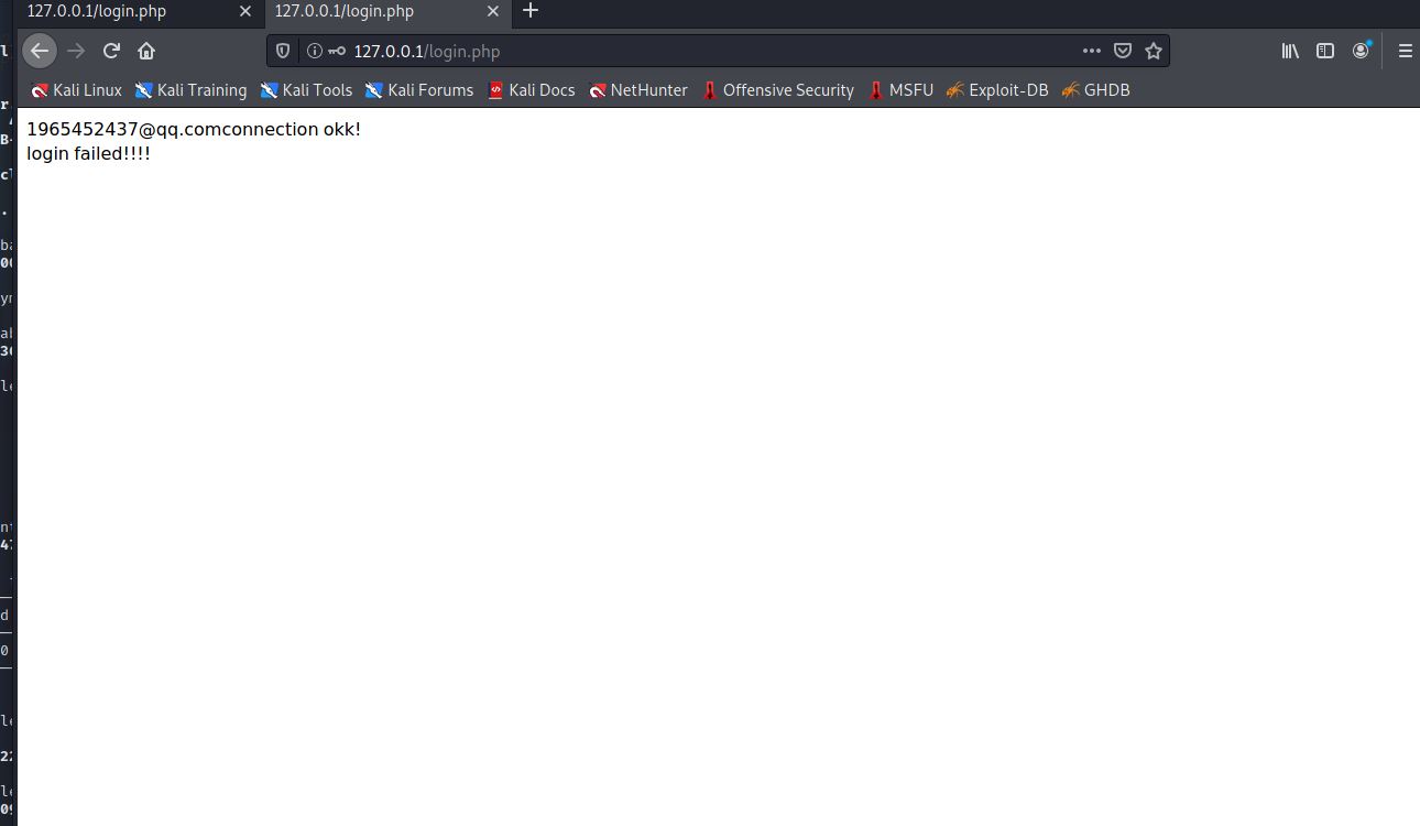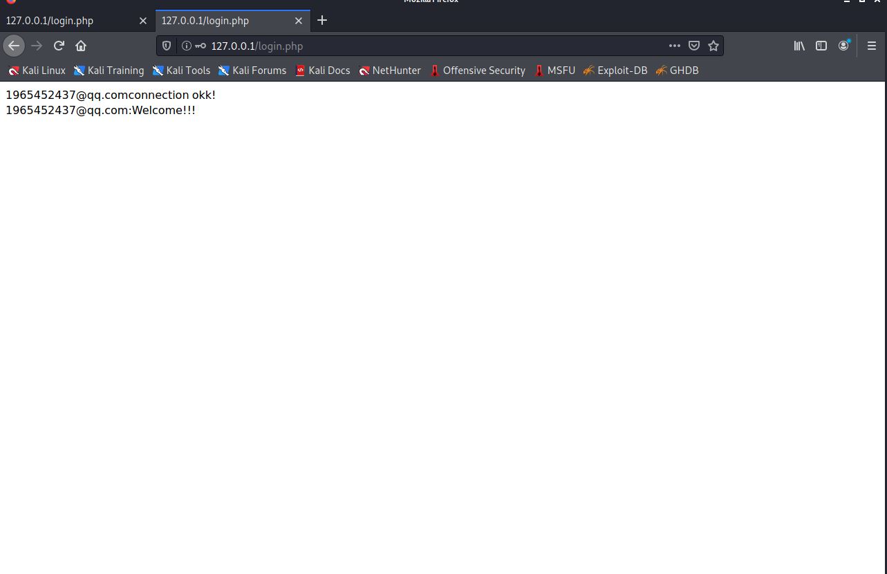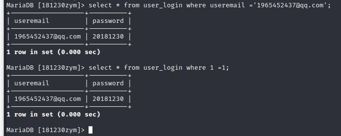 这样构造出的内部语句为:$query_str="SELECT * FROM user_login where useremail='$uname' or 1=1#' and password=',查出记录的条件从表中的username和password与所输入数据相同,变成了username和password与所输入数据相同或1=1,所以该语句一定能查出记录,数据库中执行结果如下:
