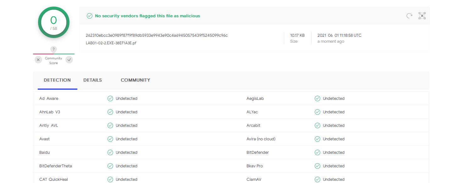 可以看到有读文件,创建可疑文件LAB01-02-2.EXE-38EF1A3E.pf,但经检测无毒。