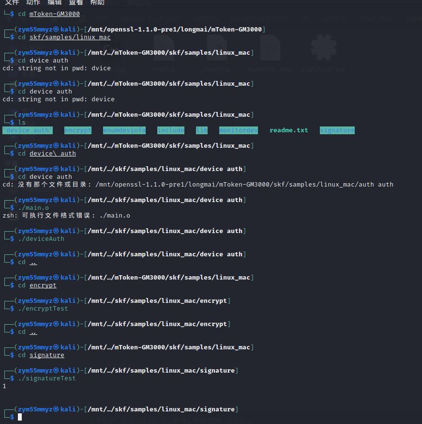 2 在Ubuntu中运行 “龙脉密码钥匙驱动实例工具等\mToken-GM3000\skf\samples\linux_mac”中例程,提交运行结果截图