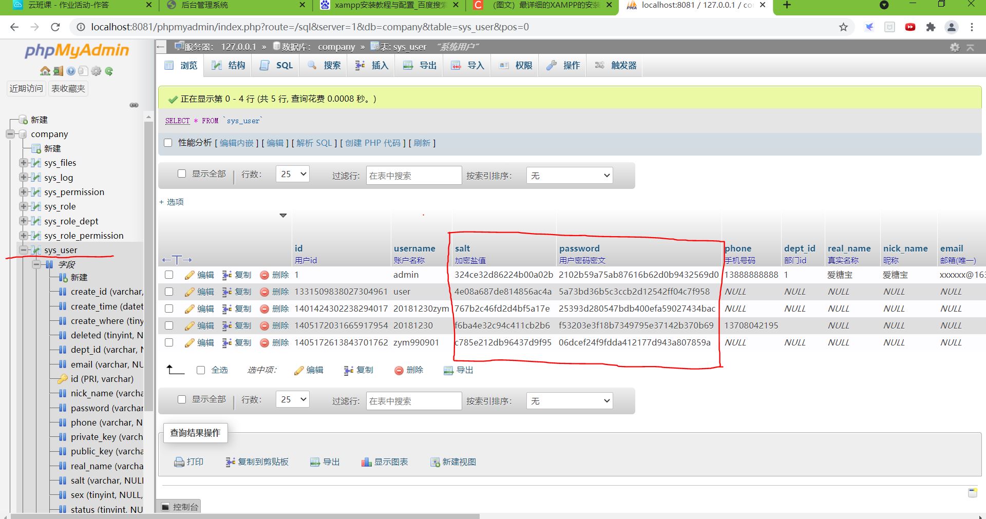 数据存在company库中的sys_user表中,这里面存放了用户的账户个人信息,包括用户id,用户名,密码,电话,邮箱,昵称,所属部门号,姓名等等