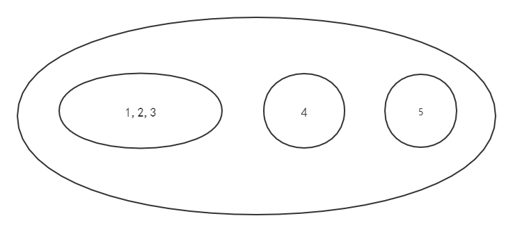 并查集,首先它是一个集合,集合中的元素是互不相交的集合。如:{{1, 2, 3}, {4}, {5}}。