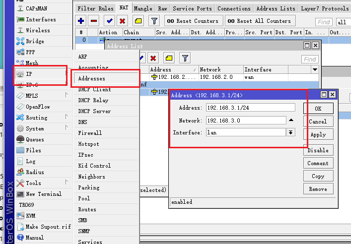 此处可以同时添加两个网络适配器,分别更改为LAN口和wan口,ROS系统与硬路由的区别就是可以自定义接口属性,不是将接口名字改为LAN口就能发挥lan口的功能,而是自定义lan口的功能