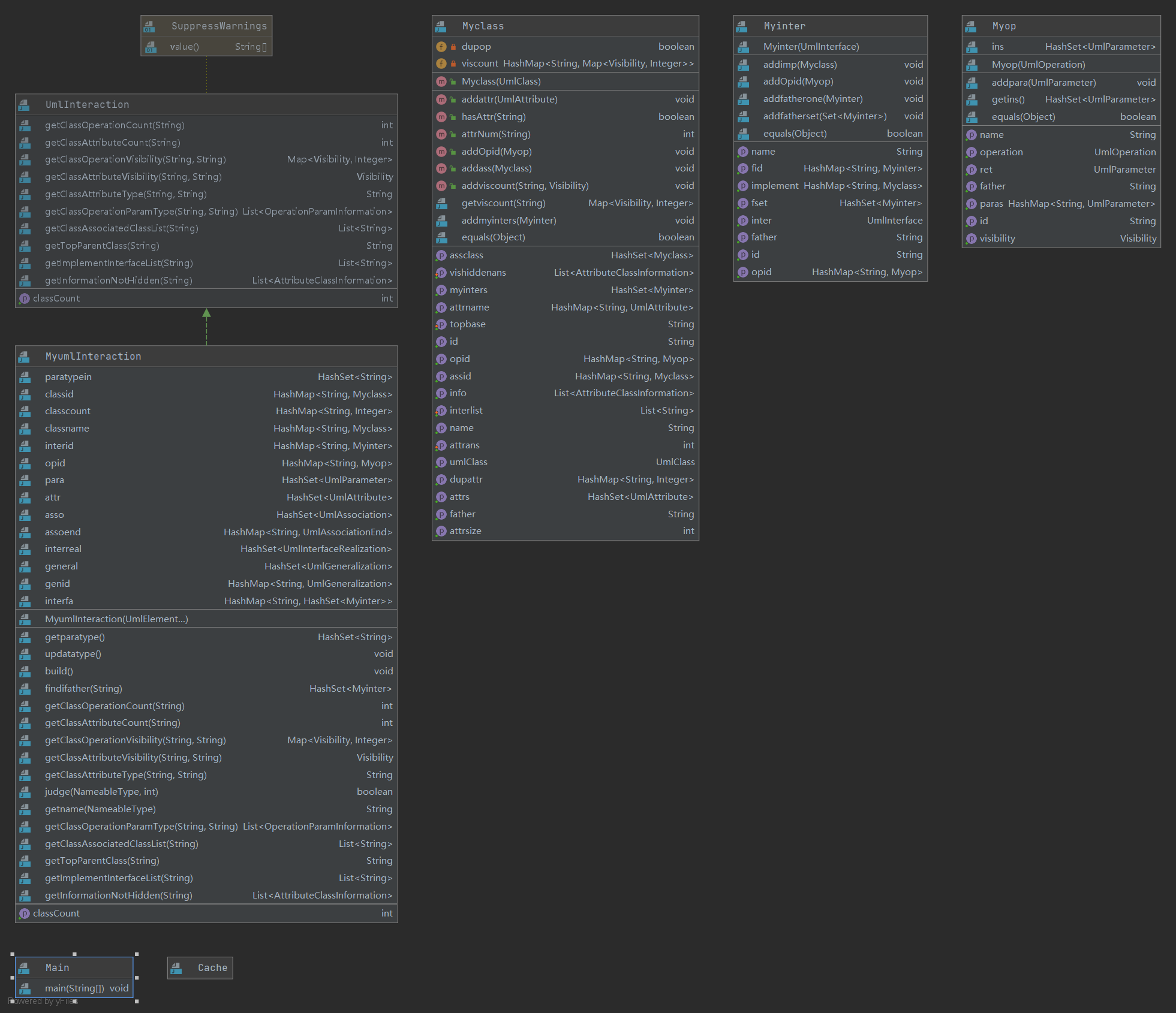 第二次作业与第一次作业相比多了时序图和状态图的解析。同样采用自顶向下的初始化方法。对于时序图,首先将Interaction初始化,接着将对应的Lifeline添加到对应的Interaction中,最后将Message添加到对应的Interaction中。由于代码量较大,所以将初始化的部分单独拆分成了一个类,并且对部分方法实现了缓存机制,让查找更加快速。