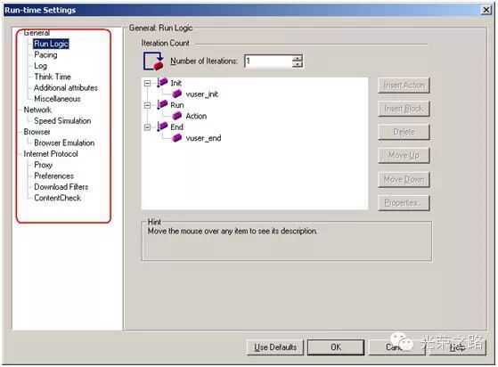 A20:可以修改Run Logic、pacing、Log、Think Time等,见下图;可以测试实际需要,修改相关选项。