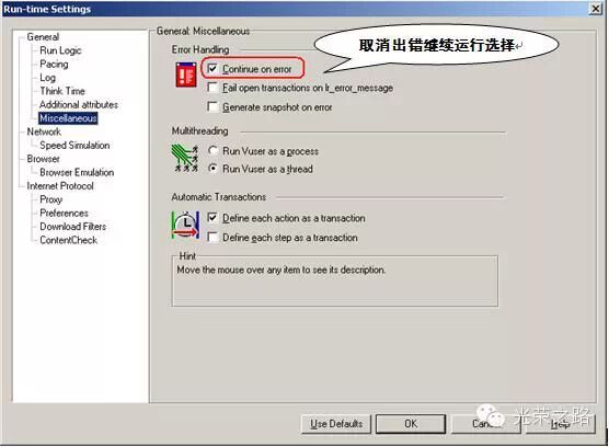 Error Handling:你能指定一个虚拟用户在脚本执行期间如何处理错误,默认的,当一个虚拟用户发现一个错误的时候,它会随着下一次重复继续下去,你能使用这个设置来通知虚拟用户当发生错误的时候是否继续执行脚本。