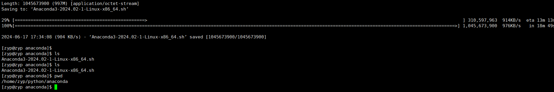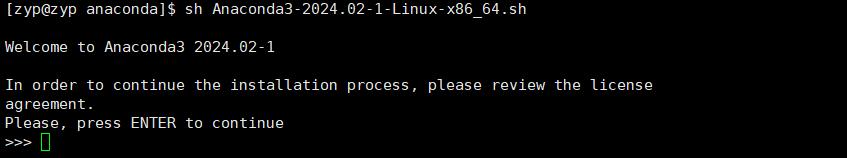 sh Anaconda3-2024.02-1-Linux-x86_64.sh 阅读完成后输入yes,接下一直默认等待安装完成,然后安装目录是再/home/zyp/anaconda3,有提示的