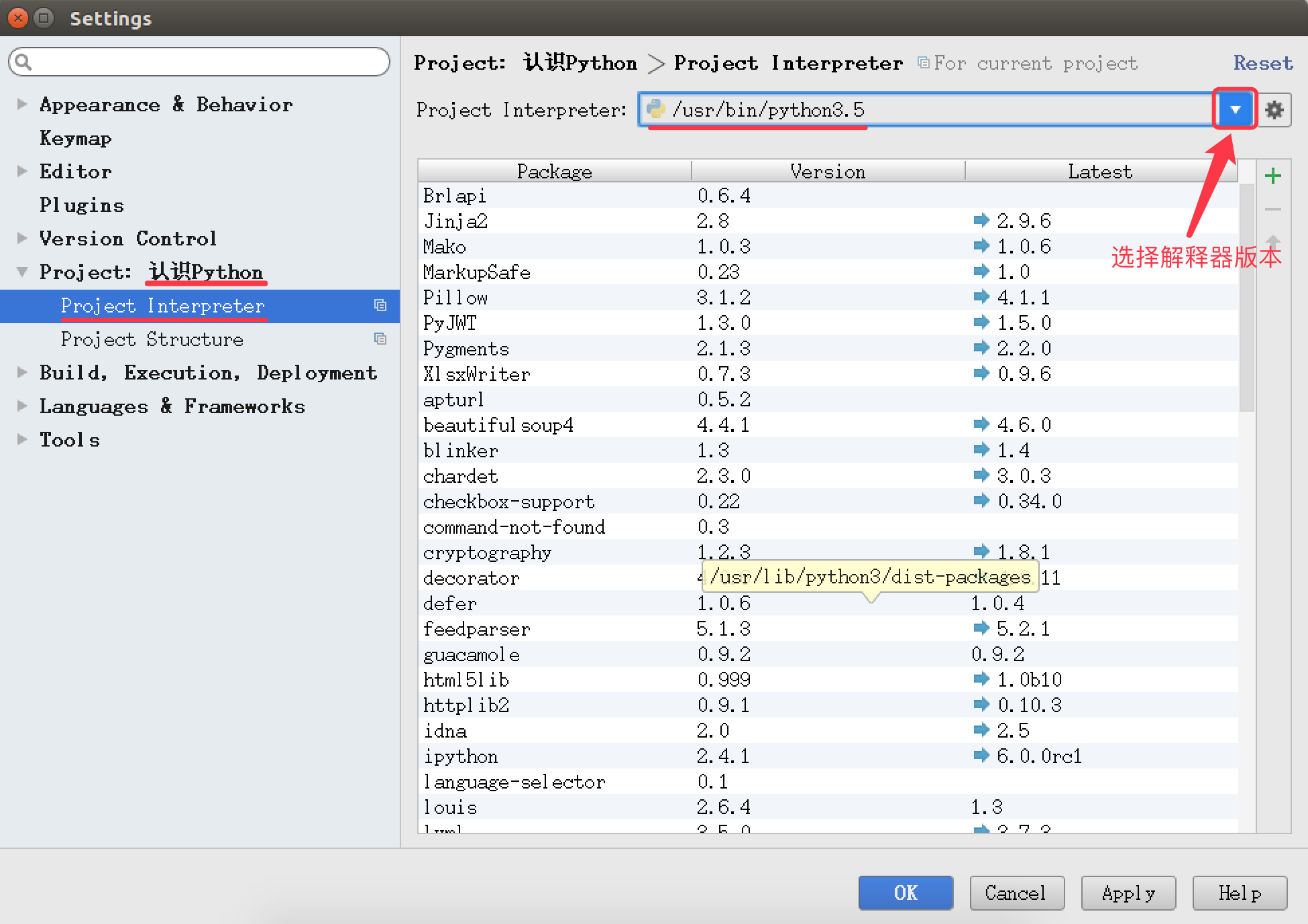 PyCharm建立的项目目录,有的时候 使用的解释器版本是Python 2.x的,需要单独设置解释器的版本 - 通 File / Settings... 可以打开设置窗口,如下图所示: