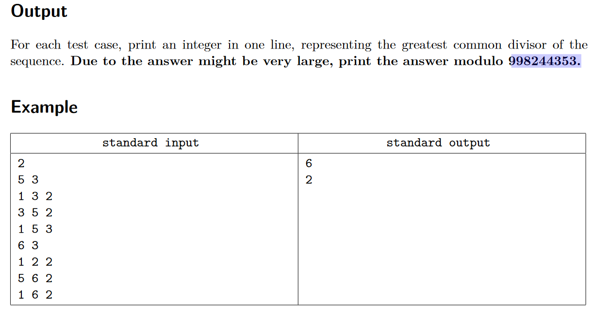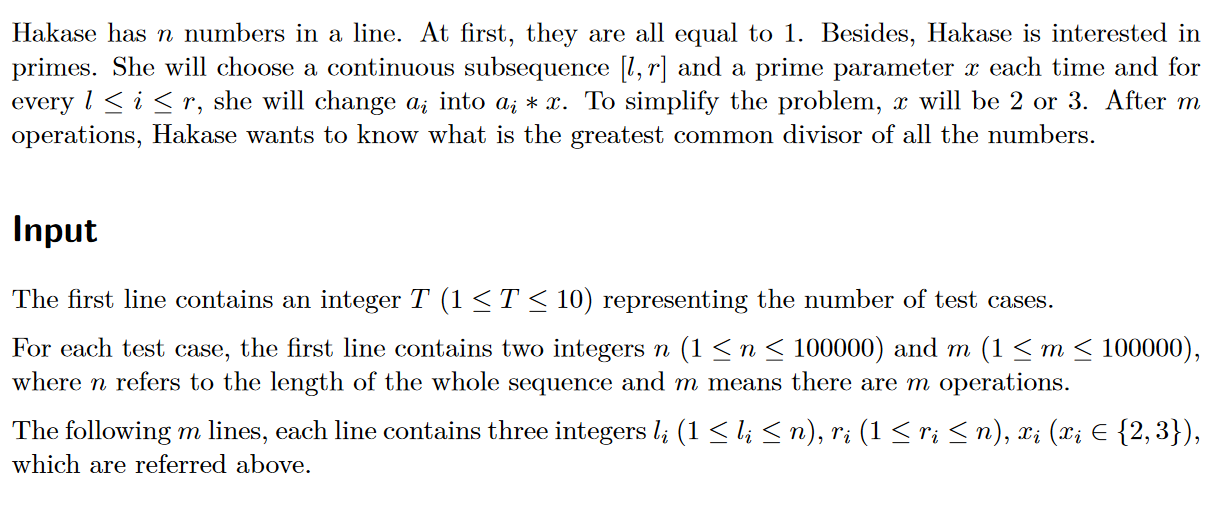 初始数组中的数都为1,每次选一个区间[l, r], 使该区间中的数乘2或3, 最后求所有数的最大公约数。
