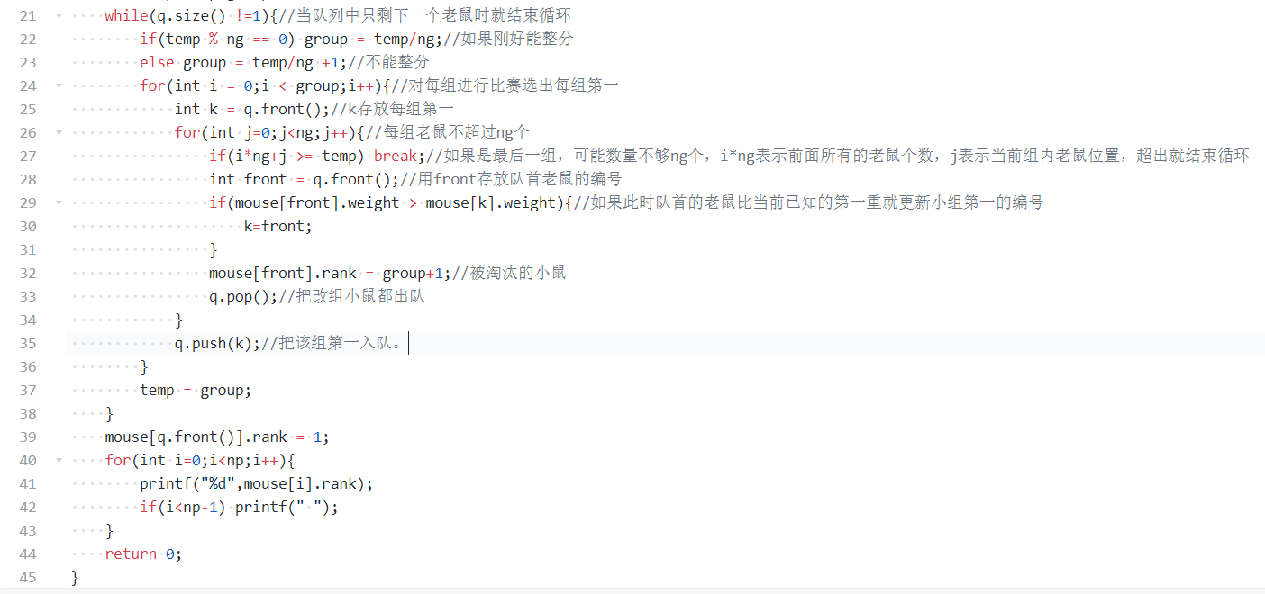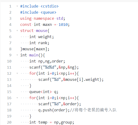 算法思路:首先定义一个mouse结构体,结构体中存放质量和排名;需要一个队列处理每轮比赛中晋级的老鼠。因为有排名相同的老鼠存在所以可能出现有两个第2名从而没有第三名的情况。所以排名group为每轮分组的个数加一,因为每组必有一个老鼠出现,那么group组有group只老鼠,这group只老鼠会占前group名。