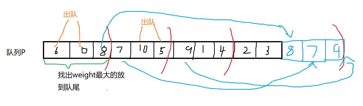 算法详细分析:因为队列的性质是先进先出,所以可以循环的使用这个队列,如输入案例,首先入队的是6、0、8这其实是mouse[]的下标,这三个元素比较后会保留weight大的mouse把下标入队,其他元素出队并给rank赋值,每次for(i<group)循环都会产生一个最大的weight并入队,所以队中元素在逐渐减少,到队里只剩下一个元素时,就是最后的冠军。在最后只需要按顺序输出mouse中rank的值就可以了。