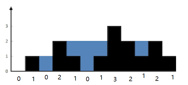 解释:上面是由数组 [0,1,0,2,1,0,1,3,2,1,2,1] 表示的高度图,在这种情况下,可以接 6 个单位的雨水(蓝色部分表示雨水)。