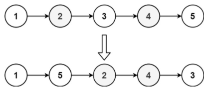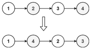 由题干描述信息,不难发现,就是要将链表的后一半结点反转,然后交错的插入前一半链表。使用快慢指针找到中间元素,然后断开后一半元素,反转后交错差入前一半元素