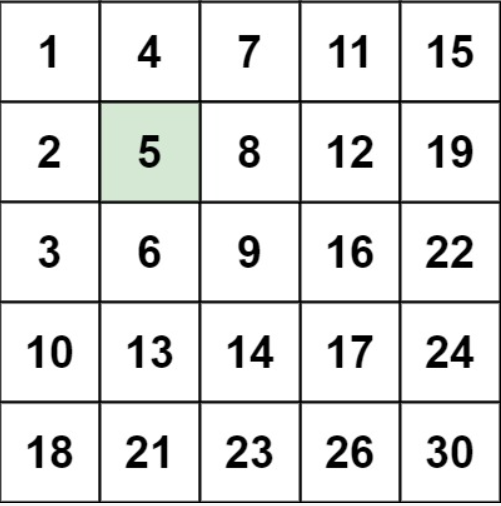 输入:matrix = [[1,4,7,11,15],[2,5,8,12,19],[3,6,9,16,22],[10,13,14,17,24],[18,21,23,26,30]], target = 5