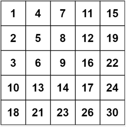 输入:matrix = [[1,4,7,11,15],[2,5,8,12,19],[3,6,9,16,22],[10,13,14,17,24],[18,21,23,26,30]], target = 20