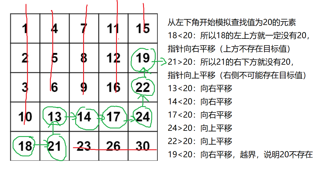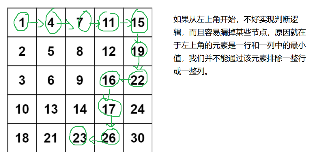 出发点的选择,我们需要排除的元素是当前元素的左上方或右下方,如果从整个矩阵的左上方出发,当下移指针的时候就新添加了某些节点,但是就不能判断这些节点中有没有要找的元素,如果从左下方和右上方出发,因为该处节点必定时一列(一行)中的最大值,那么就可以确定该行或该列中有没有目标元素。