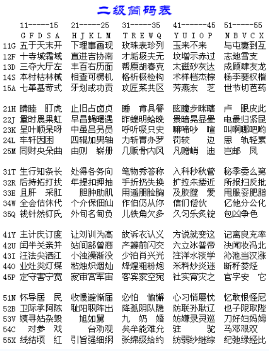 三级简码:数量较多,输入三级简码字也只需击四键(含一个空格键),三个简码字母与全码的前三者相同。但用空格代替了末字根或代替识别码。