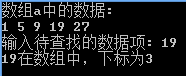 #include <stdio.h> const int N=5; int binarySearch(int *x, int n, int item); int main() { int a[N]={1,5,9,19,27}; int i,index, key; printf("数组a中的数据:\n"); for(i=0;i<N;i++) printf("%d ",a[i]); printf("\n"); printf("输入待查找的数据项: "); scanf("%d", &key); // 调用函数binarySearch()在数组a中查找指定数据项item,并返回查找结果