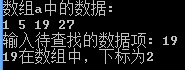 #include <stdio.h> const int N=5; int binarySearch(int x[], int n, int item); int main() { int a[N]={1,5,9,19,27}; int i,index, key; printf("数组a中的数据:\n"); for(i=0;i<N;i++) printf("%d ",a[i]); printf("\n"); printf("输入待查找的数据项: "); scanf("%d", &key); // 调用函数binarySearch()在数组a中查找指定数据项item,并返回查找结果给index index=binarySearch(a,N,key); if(index>=0) printf("%d在数组中,下标为%d\n", key, index); else printf("%d不在数组中\n", key); return 0; } int binarySearch(int x[], int n, int item) { int low, high, mid; low = 0; high = n-1; while(low <= high) { mid = (low+high)/2; if (item == x[mid]) return mid; else if(item<x[mid]) high = mid - 1; else low = mid + 1; } return -1; }