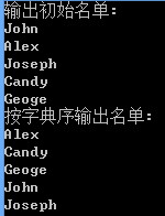 1 #include <stdio.h> 2 #include <string.h> 3 void selectSort(char str[][20], int n ); // 函数声明,形参str是二维数组名 4 int main() { 5 char name[][20] = {"John", "Alex", "Joseph", "Candy", "Geoge"}; 6 int i; 7 8 printf("输出初始名单:\n"); 9 for(i=0; i<5; i++) 10 printf("%s\n", name[i]); 11 12 selectSort(name, 5); // 调用选择法对name数组中的字符串排序 13 14 printf("按字典序输出名单:\n"); 15 for(i=0; i<5; i++) 16 printf("%s\n", name[i]); 17 18 return 0; 19 } 20 21 // 函数定义 22 // 函数功能描述:使用选择法对二维数组str中的n个字符串按字典序排序 23 void selectSort(char str[][20], int n) { 24 int i,j,k; 25 char p[20]; 26 for(i=0;i<n-1;i++){ 27 k=i; 28 strcpy(p,str[i]); 29 for(j=i+1;j<n;j++) 30 if(strcmp(str[j],str[k])<0) 31 k=j; 32 strcpy(p,str[j]); 33 34 if(k!=i){ 35 strcpy(p,str[i]); 36 strcpy(str[i],str[k]); 37 strcpy(str[k],p); 38 } 39 } 40 }