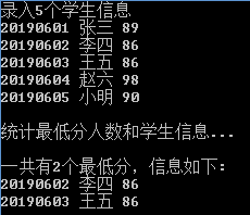 1 #include <stdio.h> 2 3 const int N=5; 4 5 // 定义结构体类型struct student,并定义STU为其别名 6 typedef struct student { 7 long no; 8 char name[20]; 9 int score; 10 }STU; 11 12 // 函数声明 13 void input(STU s[], int n); 14 int findMinlist(STU s[], STU t[], int n); 15 void output(STU s[], int n); 16 17 int main() { 18 STU stu[N], minlist[N]; 19 int count; 20 21 printf("录入%d个学生信息\n", N); 22 input(stu, N); 23 24 printf("\n统计最低分人数和学生信息...\n"); 25 count = findMinlist(stu, minlist, N); 26 27 printf("\n一共有%d个最低分,信息如下:\n", count); 28 output(minlist, count); 29 30 return 0; 31 } 32 33 // 输入n个学生信息,存放在结构体数组s中 34 void input(STU s[], int n) { 35 int i; 36 for(i=0; i<n; i++) 37 scanf("%ld %s %d", &s[i].no, s[i].name, &s[i].score); 38 } 39 40 // 输出结构体s中n个元素信息 41 void output(STU s[], int n) { 42 int i; 43 for(i=0; i<n; i++) 44 printf("%ld %s %d\n", s[i].no, s[i].name, s[i].score); 45 } 46 47 // 在结构体数组s中,查找最低分学生的记录,将其存入结构体数组s中 48 // 形参n是结构体数组s中元素个数 49 // 函数返回最低分的学生人数 50 int findMinlist(STU s[], STU t[], int n) { 51 // 补足函数实现 52 // ××× 53 int i,j=0; 54 int min; 55 min=s[0].score; 56 for(i=0;i<n;i++){ 57 if(s[i].score<min){ 58 min=s[i].score; 59 } 60 } 61 for(i=0;i<n;i++){ 62 if(min==s[i].score){ 63 t[j++]=s[i]; 64 } 65 } 66 return j; 67 }