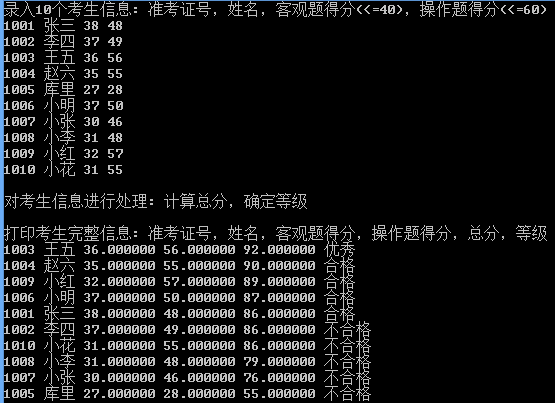 1 #include <stdio.h> 2 #include <string.h> 3 const int N = 10; 4 5 // 定义结构体类型struct student,并定义其别名为STU 6 typedef struct student { 7 long int id; 8 char name[20]; 9 float objective; /*客观题得分*/ 10 float subjective; /*操作题得分*/ 11 float sum; 12 char level[10]; 13 }STU; 14 15 // 函数声明 16 void input(STU s[], int n); 17 void output(STU s[], int n); 18 void process(STU s[], int n); 19 20 int main() { 21 STU stu[N]; 22 23 printf("录入%d个考生信息: 准考证号,姓名,客观题得分(<=40),操作题得分(<=60)\n", N); 24 input(stu, N); 25 26 printf("\n对考生信息进行处理: 计算总分,确定等级\n"); 27 process(stu, N); 28 29 printf("\n打印考生完整信息: 准考证号,姓名,客观题得分,操作题得分,总分,等级\n"); 30 output(stu, N); 31 32 return 0; 33 } 34 35 // 录入考生信息:准考证号,姓名,客观题得分,操作题得分 36 void input(STU s[], int n) { 37 // 补足代码 38 // ××× 39 int i; 40 for(i=0;i<n;i++){ 41 scanf("%ld %s %f %f",&s[i].id,s[i].name,&s[i].objective,&s[i].subjective); 42 } 43 } 44 45 //输出考生完整信息: 准考证号,姓名,客观题得分,操作题得分,总分,等级 46 void output(STU s[], int n) { 47 // 补足代码 48 // ××× 49 int i; 50 for(i=0;i<n;i++){ 51 printf("%ld %s %f %f %f %s\n",s[i].id,s[i].name,s[i].objective,s[i].subjective,s[i].sum,s[i].level); 52 } 53 } 54 55 // 对考生信息进行处理:计算总分,排序,确定等级 56 void process(STU s[], int n) { 57 // 补足代码 58 // ××× 59 int i,j; 60 STU t; 61 //计算总分 62 for(i=0;i<n;i++){ 63 s[i].sum=s[i].objective+s[i].subjective; 64 } 65 //冒泡法排序 66 for(i=0;i<n-1;i++){ 67 for(j=0;j<n-1-i;j++){ 68 if(s[j].sum<s[j+1].sum){ 69 t=s[j]; 70 s[j]=s[j+1]; 71 s[j+1]=t; 72 } 73 } 74 } 75 //确定等级 76 strcpy(s[0].level,"优秀"); 77 for(i=1;i<=4;i++){ 78 strcpy(s[i].level,"合格"); 79 } 80 for(i=5;i<=9;i++){ 81 strcpy(s[i].level,"不合格"); 82 } 83 }