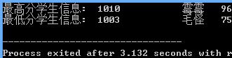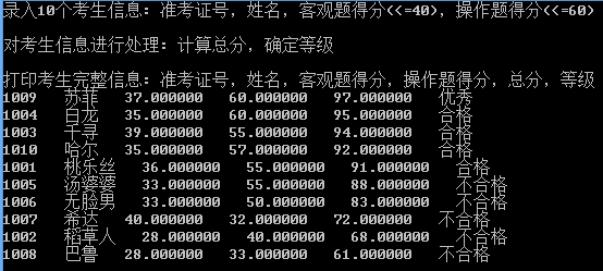 1 #include <stdio.h> 2 #include <string.h> 3 #include <stdlib.h> 4 const int N = 10; 5 6 // 定义结构体类型struct student,并定义其别名为STU 7 typedef struct student { 8 long int id; 9 char name[20]; 10 float objective; /*客观题得分*/ 11 float subjective; /*操作题得分*/ 12 float sum; 13 char level[10]; 14 }STU; 15 16 // 函数声明 17 void input(STU s[], int n); 18 void output(STU s[], int n); 19 void process(STU s[], int n); 20 21 int main() { 22 STU stu[N]; 23 24 printf("录入%d个考生信息: 准考证号,姓名,客观题得分(<=40),操作题得分(<=60)\n", N); 25 input(stu, N); 26 27 printf("\n对考生信息进行处理: 计算总分,确定等级\n"); 28 process(stu, N); 29 30 printf("\n打印考生完整信息: 准考证号,姓名,客观题得分,操作题得分,总分,等级\n"); 31 output(stu, N); 32 33 return 0; 34 } 35 36 // 从文本文件examinee.txt读入考生信息:准考证号,姓名,客观题得分,操作题得分 37 void input(STU s[], int n) { 38 // 补足代码 39 // ××× 40 FILE *fp; 41 int i; 42 fp=fopen("examinee.txt","r"); 43 if(!fp){ 44 printf("fail to open examinee.txt\n"); 45 exit(0); 46 } 47 for(i=0;i<n;i++){ 48 fscanf(fp,"%ld %s %f %f",&s[i].id,s[i].name,&s[i].objective,&s[i].subjective);//从文件中读取各种信息 49 } 50 fclose(fp); 51 } 52 53 // 输出考生完整信息: 准考证号,姓名,客观题得分,操作题得分,总分,等级 54 // 不仅输出到屏幕上,还写到文本文件result.txt中 55 void output(STU s[], int n) { 56 // 补足代码 57 // ××× 58 FILE *fpp; 59 int i; 60 fpp=fopen("result.txt","w"); 61 if(!fpp){ 62 printf("fail to open result.txt\n"); 63 exit(0); 64 } 65 for(i=0;i<n;i++){ 66 printf("%ld %s %lf %lf %lf %s\n",s[i].id,s[i].name,s[i].objective,s[i].subjective,s[i].sum,s[i].level);//输出至屏幕 67 fprintf(fpp,"%ld %s %lf %lf %lf %s\n",s[i].id,s[i].name,s[i].objective,s[i].subjective,s[i].sum,s[i].level);//输出至文件 68 } 69 fclose(fpp); 70 } 71 72 // 对考生信息进行处理:计算总分,排序,确定等级 73 void process(STU s[], int n) { 74 // 补足代码 75 // ××× 76 int i,j; 77 STU t; 78 //计算总分 79 for(i=0;i<n;i++){ 80 s[i].sum=s[i].objective+s[i].subjective; 81 } 82 //冒泡法排序 83 for(i=0;i<n;i++){ 84 for(j=0;j<n-1-i;j++){ 85 if(s[j].sum<s[j+1].sum){ 86 t=s[j]; 87 s[j]=s[j+1]; 88 s[j+1]=t; 89 } 90 } 91 } 92 //确定等级 93 strcpy(s[0].level,"优秀"); 94 for(i=1;i<=4;i++){ 95 strcpy(s[i].level,"合格"); 96 } 97 for(i=5;i<=9;i++){ 98 strcpy(s[i].level,"不合格"); 99 } 100 }