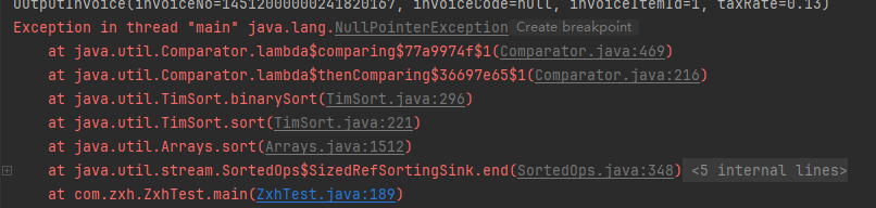 public static void main(String[] args) { OutputInvoice outputInvoice = new OutputInvoice(); OutputInvoice outputInvoice2 = new OutputInvoice(); OutputInvoice outputInvoice3 = new OutputInvoice(); OutputInvoice outputInvoice4 = new OutputInvoice(); OutputInvoice outputInvoice5 = new OutputInvoice(); OutputInvoice outputInvoice6 = new OutputInvoice(); outputInvoice.setInvoiceCode("1300232130").setInvoiceNo("18298398").setTaxRate(new BigDecimal("0.09")).setInvoiceItemId("1"); outputInvoice2.setInvoiceCode("1300232130").setInvoiceNo("18298391").setTaxRate(new BigDecimal("0.09")).setInvoiceItemId("21"); outputInvoice3.setInvoiceCode("1300232130").setInvoiceNo("18298391").setTaxRate(new BigDecimal("0.09")).setInvoiceItemId("2"); outputInvoice4.setInvoiceCode("1300232130").setInvoiceNo("18298391").setTaxRate(new BigDecimal("0.09")).setInvoiceItemId("15"); outputInvoice5.setInvoiceCode("1300232131").setInvoiceNo("18298399").setTaxRate(new BigDecimal("0.13")).setInvoiceItemId("1"); outputInvoice6.setInvoiceNo("14512000000241820167").setTaxRate(new BigDecimal("0.13")).setInvoiceItemId("1"); List<OutputInvoice> list = new ArrayList<>(); list.add(outputInvoice); list.add(outputInvoice2); list.add(outputInvoice3); list.add(outputInvoice4); list.add(outputInvoice5); list.add(outputInvoice6); System.out.println("排序前:"); list.stream().forEach(System.out::println); //根据发票号码排序 List<OutputInvoice> sortList = list.stream() .sorted(Comparator.comparing(OutputInvoice::getInvoiceNo)).collect(Collectors.toList()); System.out.println("排序后:"); sortList.stream().forEach(System.out::println); }