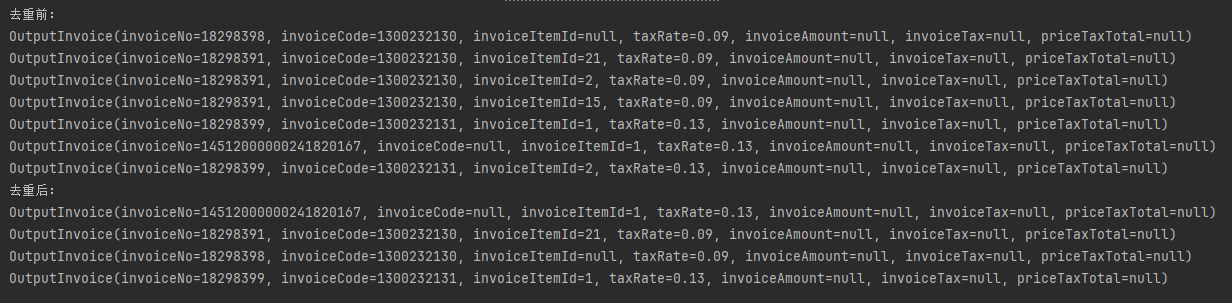 OutputInvoice outputInvoice = new OutputInvoice(); OutputInvoice outputInvoice2 = new OutputInvoice(); OutputInvoice outputInvoice3 = new OutputInvoice(); OutputInvoice outputInvoice4 = new OutputInvoice(); OutputInvoice outputInvoice5 = new OutputInvoice(); OutputInvoice outputInvoice6 = new OutputInvoice(); OutputInvoice outputInvoice7 = new OutputInvoice(); outputInvoice.setInvoiceCode("1300232130").setInvoiceNo("18298398").setTaxRate(new BigDecimal("0.09")); outputInvoice2.setInvoiceCode("1300232130").setInvoiceNo("18298391").setTaxRate(new BigDecimal("0.09")).setInvoiceItemId("21"); outputInvoice3.setInvoiceCode("1300232130").setInvoiceNo("18298391").setTaxRate(new BigDecimal("0.09")).setInvoiceItemId("2"); outputInvoice4.setInvoiceCode("1300232130").setInvoiceNo("18298391").setTaxRate(new BigDecimal("0.09")).setInvoiceItemId("15"); outputInvoice5.setInvoiceCode("1300232131").setInvoiceNo("18298399").setTaxRate(new BigDecimal("0.13")).setInvoiceItemId("1"); outputInvoice6.setInvoiceNo("14512000000241820167").setTaxRate(new BigDecimal("0.13")).setInvoiceItemId("1"); outputInvoice7.setInvoiceCode("1300232131").setInvoiceNo("18298399").setTaxRate(new BigDecimal("0.13")).setInvoiceItemId("2"); List<OutputInvoice> list = new ArrayList<>(); list.add(outputInvoice); list.add(outputInvoice2); list.add(outputInvoice3); list.add(outputInvoice4); list.add(outputInvoice5); list.add(outputInvoice6); list.add(outputInvoice7); System.out.println("去重前:"); list.stream().forEach(System.out::println); //根据发票号码,代码,税率,明细行去重 List<OutputInvoice> newList = list.stream().collect(Collectors.toMap( p -> p.getInvoiceNo(), //也可使用 OutputInvoice::getInvoiceNo,单个参数时二者选一 // OutputInvoice::getInvoiceNo, Function.identity(), (existing, replacement) -> existing )).values().stream().collect(Collectors.toList()); System.out.println("去重后:"); newList.stream().forEach(System.out::println);
