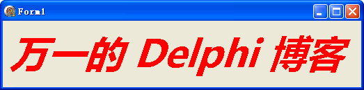 //因为 Canvas 的 Font 属性就是 TFONT 类的一个实例, 所以上面的程序可以简化为: procedure TForm1.FormPaint(Sender: TObject); const S = '万一的 Delphi 博客'; begin Canvas.Font.Name := '微软雅黑'; Canvas.Font.Style := [fsBold, fsItalic]; Canvas.Font.Color := clRed; Canvas.Font.Height := 72; Canvas.TextOut(10, 10, S); end;