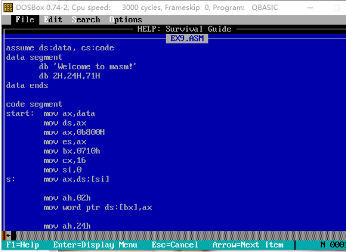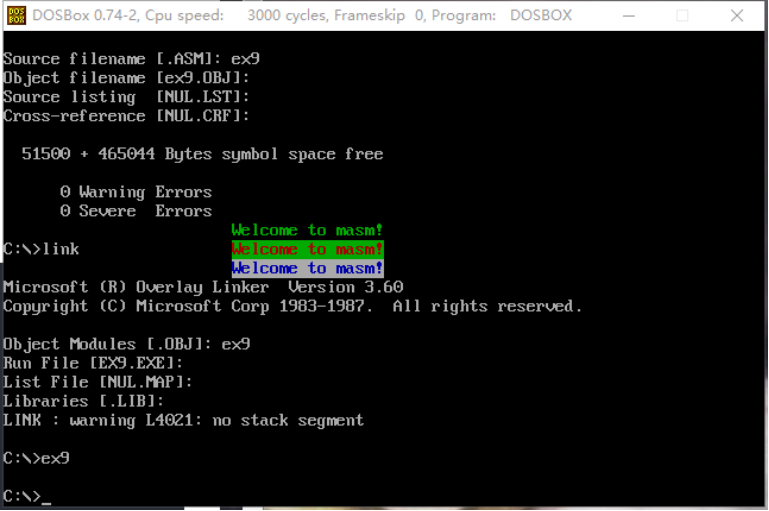 在屏幕中间分别显示绿色、绿底红色、白底蓝色的字符串’welcome to masm’。
