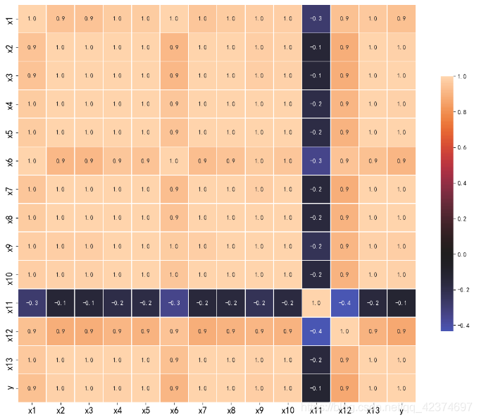 plt.figure(figsize=(12,12)) sns.heatmap(data.corr(), center=0, square=True, linewidths=.5, cbar_kws={"shrink": .5},annot=True, fmt='.1f') #设置x轴 plt.xticks(fontsize=15) #设置y轴 plt.yticks(fontsize=15) plt.tight_layout() plt.savefig('a.png')