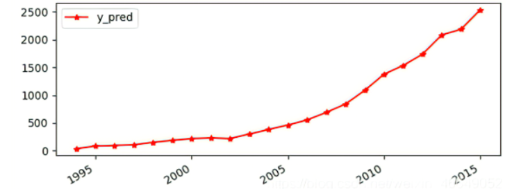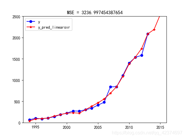 from sklearn.svm import LinearSVR import matplotlib.pyplot as plt data = pd.read_excel('new_reg_data_GM11.xls',index_col=0,header=0) # 读取数据 feature = ['x1', 'x3', 'x4', 'x5', 'x6', 'x7', 'x8', 'x13'] # 属性所在列 data_train = data.loc[range(1994, 2014)].copy() # 取2014年前的数据建模 # 数据标准化 data_mean = data_train.mean() data_std = data_train.std() data_train = (data_train - data_mean) / data_std x_train = data_train[feature].values # 属性数据 y_train = data_train['y'].values # 标签数据 # 调用LinearSVR()函数 linearsvr = LinearSVR() linearsvr.fit(x_train, y_train) x = ((data[feature] - data_mean[feature]) / data_std[feature]).values # 预测,并还原结果。 data[u'y_pred'] = linearsvr.predict(x) * data_std['y'] + data_mean['y'] # SVR预测后保存的结果 data.to_excel('new_reg_data_GM11_revenue.xls') print('真实值与预测值分别为:\n', data[['y', 'y_pred']]) fig = data[['y', 'y_pred']].plot(subplots=True, style=['b-o', 'r-*']) # 画出预测结果图 plt.show()