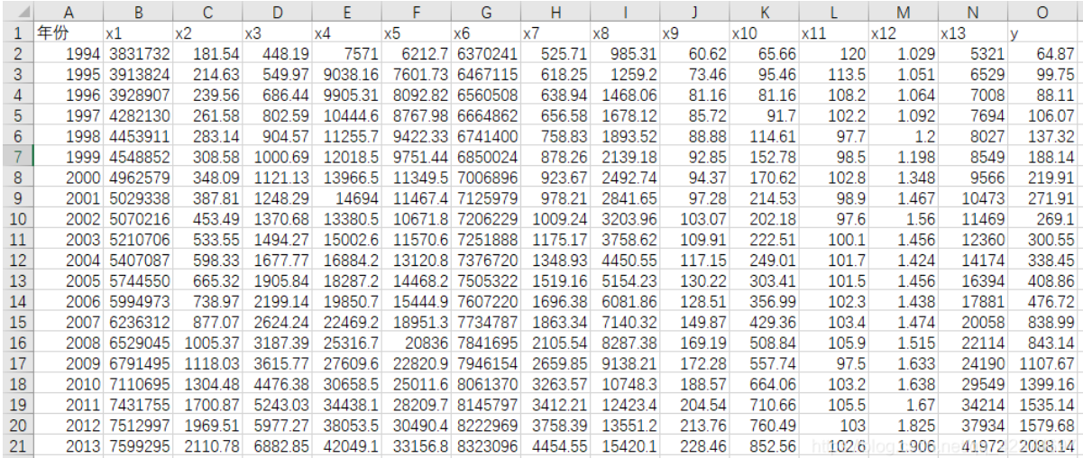 社会从业人数x1 、 在岗职工工资总额x2、社会消费品零售总额x3、城镇居民人均可支配收人x4、 城镇居民人均消费性支出x5、年末总人口x6、全社会固定资产投资额x7、地区生产总值x8、第一产业产值x9、税收x10、居民消费价格指数x11、第三产业与第二产业产值比x12、地区生产总值x8、和居民消费水平x13,y为财政收入