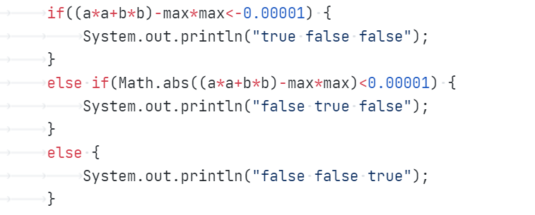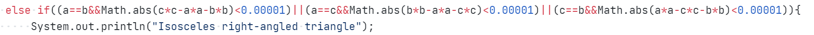 2.能够考虑到直角三角形的边长可能存在无理数,会产生误差,影响精度,故使用Math.abs(c*c-a*a-b*b)<0.00001,让判断结果更精确。