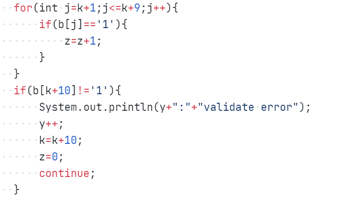 代码思路:先用if-else语句和for语句以x为标识符,判断输入数据格式是否错误,如果正确再用for语句对输入的字符串进行解析,利用z来计算“1”的个数进行奇偶效验,每次输出一个结果后,y+1来表示下一结果的顺序,k+10来略过解析完的字符串段,使用continue保证进行下一次的循环,最后对每段字符的判断若某个数据的结束符不为1,则输出“validate error”。若某个数据奇偶校验错误,则输出“parity check error”。若数据结束符和奇偶校验均不合格,输出“validate error”。得出相应的结果。