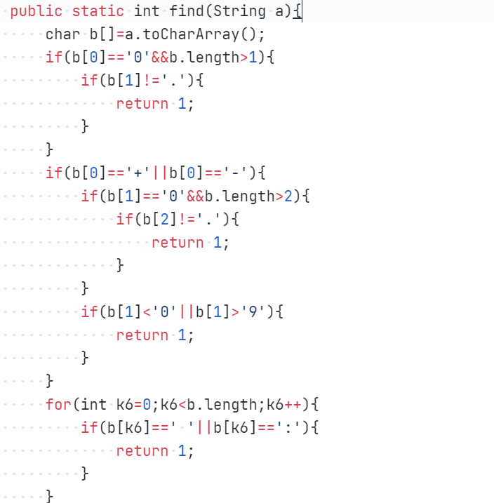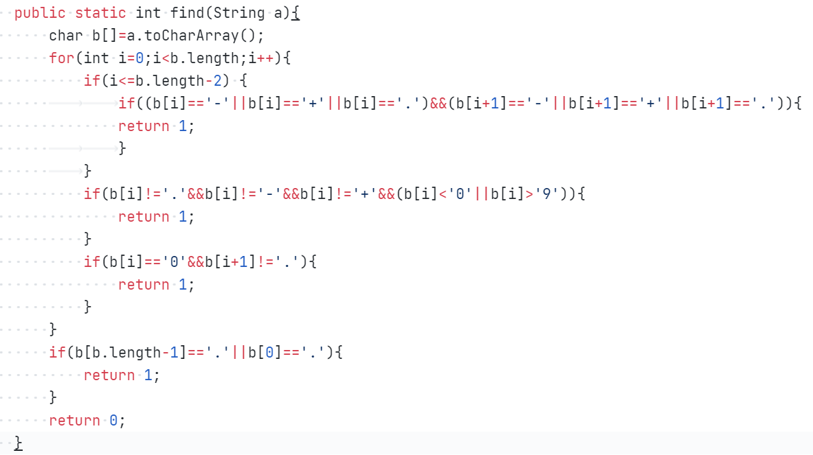 代码思路:此为find方法,返回值为int类型,用以判断输入数据的合法性。将输入的字符串a转换成为字符数组b,判断数组中除了. - + 0-9外是否还有其它非法字符,如果有返回1,并判断. - + 0-9的顺序是否有问题,如果有返回1,这些情况都没有出现,则返回0。