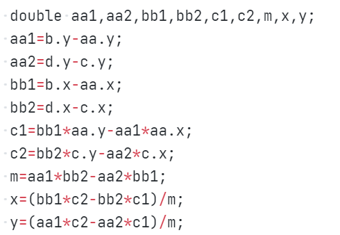 2.在对选项五计算交点时候,运用平常所学的求交点坐标貌似行不通无法通过两个测试点,我通过网上查询方法才找寻到这个能够过测试点求交点的方法。故我们应该多学习算法,不要纠结于一种算法或只掌握一种算法。以后遇到此类算交点的题目时可采用这种方法。
