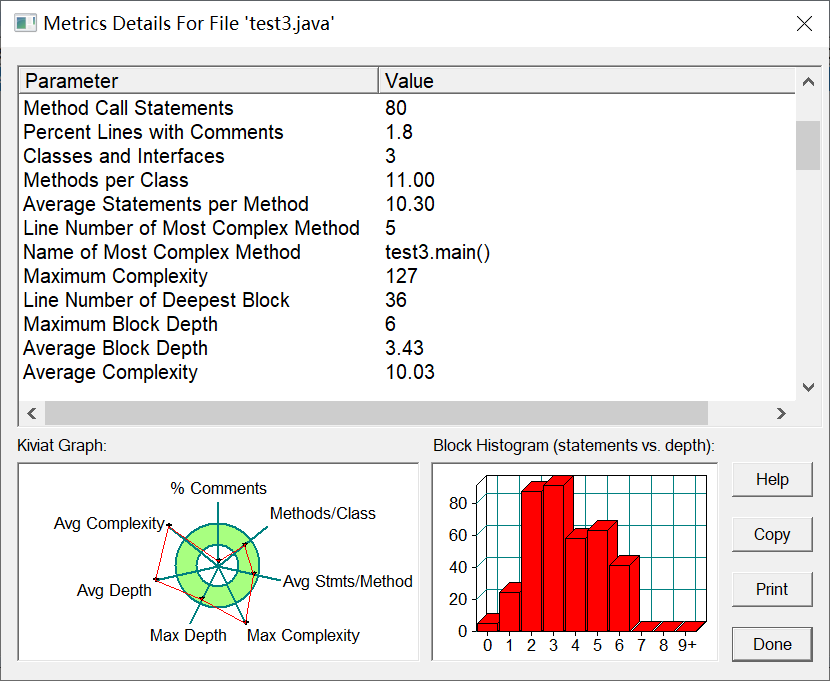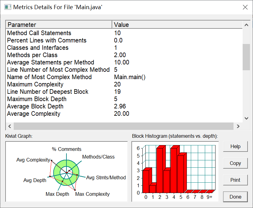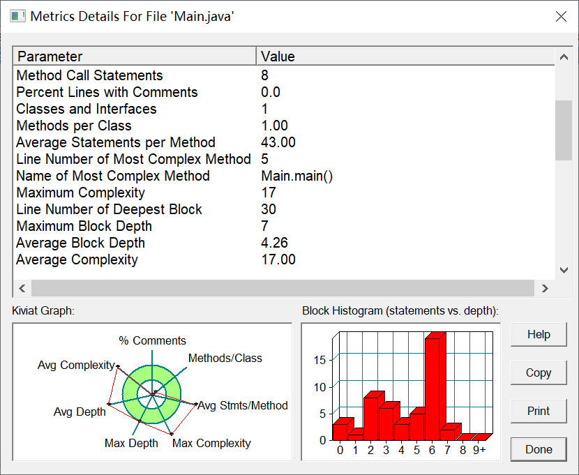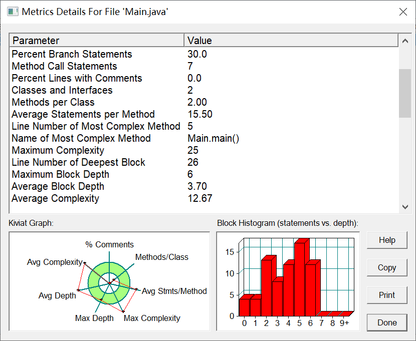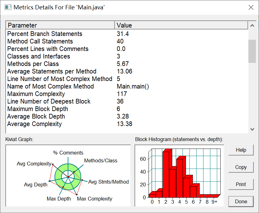 由SourceMonitor以及PowerDesigner软件测评结果可以得知,代码复杂度过高,使用了太多if-else语句,且只有一个Main类,建议减少使用if-else语句,并且可以使用switch语句来减少使用,可以创建输出类和判断类,进行多种类交互。