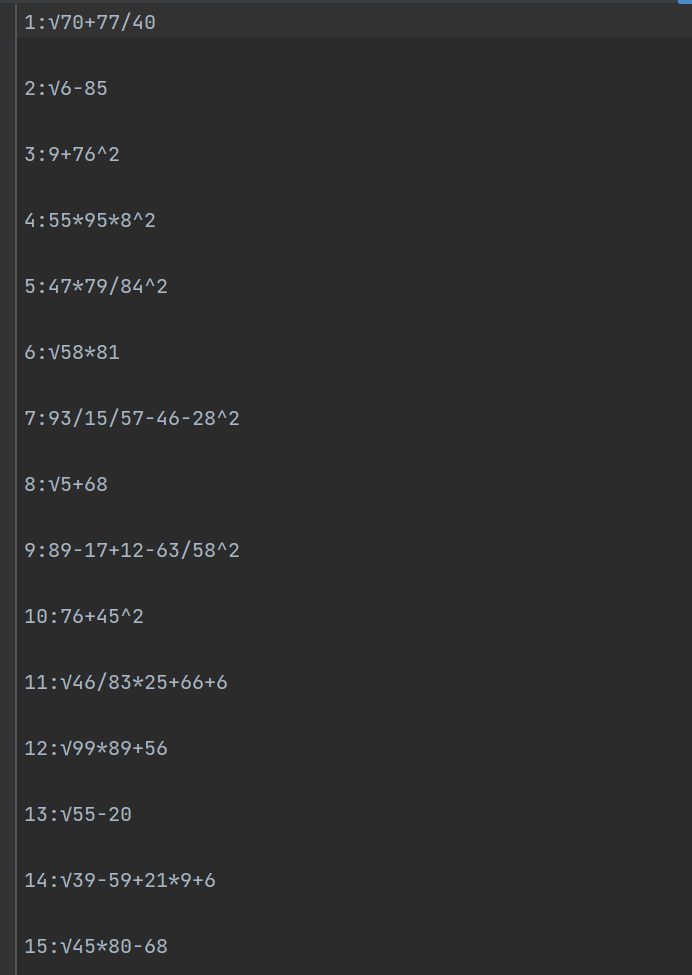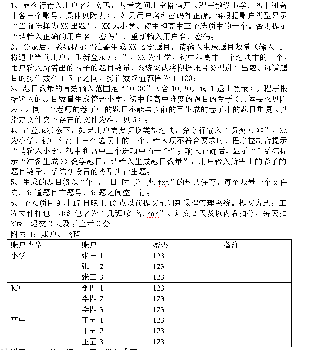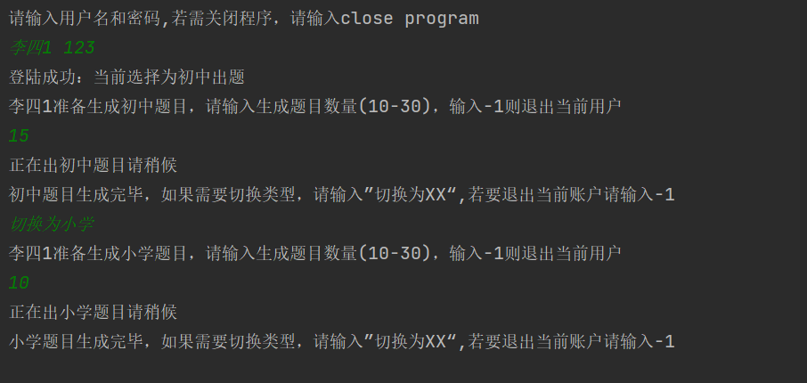 1.优点:登录界面有文字提示,并且没有bug。各个难度生成的题目满足小学、初中、高中的所有要求,生成的题目有题号并且出完每一题都会换行,任何时候都可以返回主页。切换出题难度时也有文字提示,输错和输对都会提示出题人,输错后再次输入正确的信息可以切换,每次登录可以多次出题,没有bug。有查重功能并且没有bug。保存路径分用户而定,文件名满足要求,无bug。类数量大于1,方法代码行数小于40。函数命名采用小驼峰方式。