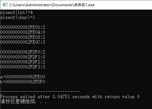 #include<stdio.h> #define N 4 int main(){ int a[N]={2,0,2,3}; char b[N]={'2','0','2','3'}; int i; printf("sizeof(int)=%d\n",sizeof(int)); printf("sizeof(char)=%d\n",sizeof(char)); printf("\n"); for(i=0;i<N;++i) printf("%p:%d\n",&a[i],a[i]); printf("\n"); for(i=0;i<N;++i) printf("%p:%c\n",&b[i],b[i]); printf("\n"); printf("a=%p\n",a); printf("b=%p\n",b); return 0; }