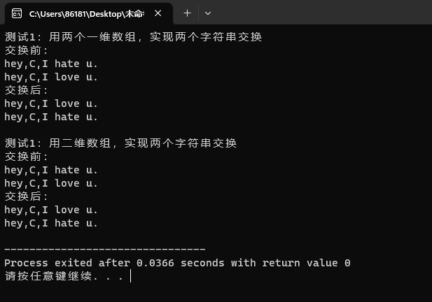 #include<stdio.h> #include<string.h> #define N 80 void swap_str(char s1[N],char s2[N]); void test1(); void test2(); int main(){ printf("测试1:用两个一维数组,实现两个字符串交换\n"); test1(); printf("\n测试1:用二维数组,实现两个字符串交换\n"); test2() ; return 0; } void test1(){ char views1[N]="hey,C,I hate u."; char views2[N]="hey,C,I love u."; printf("交换前:\n"); puts(views1); puts(views2); swap_str(views1,views2); printf("交换后:\n"); puts(views1); puts(views2); } void test2(){ char views[2][N]={"hey,C,I hate u.","hey,C,I love u."}; printf("交换前:\n"); puts(views[0]); puts(views[1]); swap_str(views[0],views[1]); printf("交换后:\n"); puts(views[0]); puts(views[1]); } void swap_str(char s1[N],char s2[N]) { char tmp[N]; strcpy(tmp,s1); strcpy(s1,s2); strcpy(s2,tmp); }