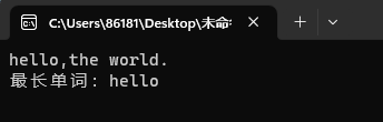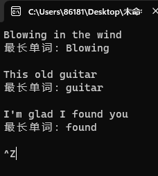#include<stdio.h> #define N 1000 int main(){ char line[N]; int word_len; int max_len; int end; int i; while(gets(line)!=NULL){ word_len=0; max_len=0; end=0; i=0; while(1){ while(line[i]==' '){ word_len=0; i++; } while(line[i]!='\0'&&line[i]!=' '){ word_len++; i++; } if(max_len<word_len){ max_len=word_len; end=i; } if(line[i]=='\0') break; } printf("最长单词:"); for(i=end-max_len;i<end;++i) printf("%c",line[i]); printf("\n\n"); } return 0; }