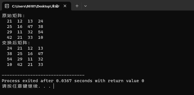 #include<stdio.h> #define N 100 #define M 4 void output(int x[][N],int n); void rotate_to_right(int x[][N],int n); int main(){ int t[][N]={{21,12,13,24}, {25,16,47,38}, {29,11,32,54}, {42,21,33,10}}; printf("原始矩阵:\n"); output(t,M); printf("变换后矩阵:\n"); rotate_to_right(t,M); return 0; } void output(int x[][N],int n){ int i,j; for(i=0;i<n;++i){ for(j=0;j<n;++j) printf("%4d",x[i][j]); printf("\n");} } void rotate_to_right(int x[][N],int n){ int i,j; for(i=0;i<n;++i){ for(j=0;j<n;++j) if(j==0) printf("%4d",x[i][n-1]); else printf("%4d",x[i][j-1]); printf("\n"); } }