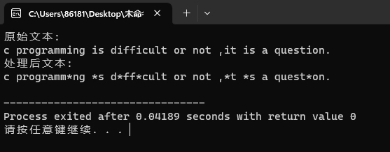 #include<stdio.h> #define N 80 void replace(char x[],char old_char,char new_char); int main(){ char text[N]="c programming is difficult or not ,it is a question."; printf("原始文本:\n"); printf("%s\n",text); replace(text,'i','*'); printf("处理后文本:\n"); printf("%s\n",text); return 0; } void replace(char x[],char old_char,char new_char){ int i; for(i=0;x[i]!='\0';++i) if(x[i]==old_char) x[i]=new_char; }