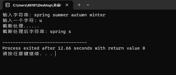 #include<stdio.h> #define N 80 int main(){ char str[N],ch; int i; printf("输入字符串:") ; gets(str) ; printf("输入一个字符:"); ch=getchar(); printf("截断处理......"); i=0; while(str[i]!='\0'){ if(str[i]==ch) break; i++;} str[i]='\0'; printf("\n截断处理后字符串:%s\n",str); return 0; }