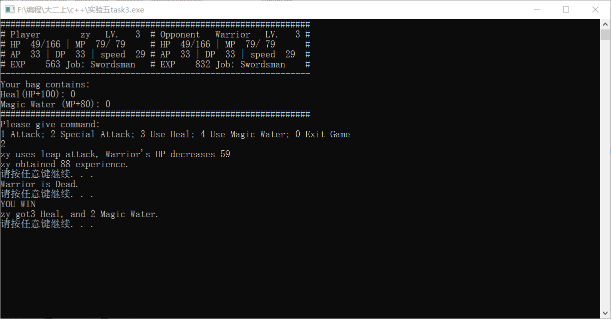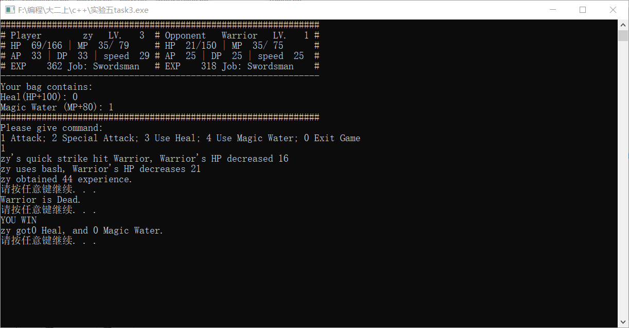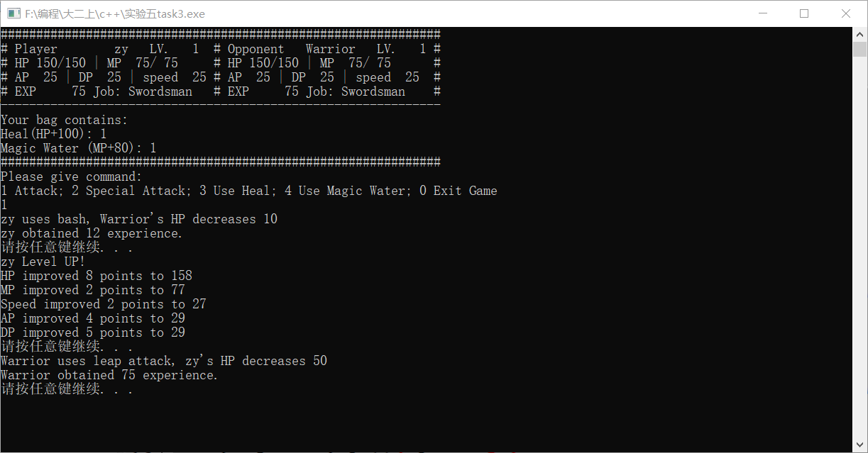//======================= // main.cpp //======================= // main function for the RPG style game #include <iostream> #include <string> using namespace std; #include "swordsman.h" int main() { string tempName; bool success=0; //flag for storing whether operation is successful cout <<"Please input player's name: "; cin >>tempName; // get player's name from keyboard input player *human; // use pointer of base class, convenience for polymorphism int tempJob; // temp choice for job selection do { cout <<"Please choose a job: 1 Swordsman, 2 Archer, 3 Mage"<<endl; cin>>tempJob; system("cls"); // clear the screen switch(tempJob) { case 1: human=new swordsman(1,tempName); // create the character with user inputted name and job success=1; // operation succeed break; default: break; // In this case, success=0, character creation failed } }while(success!=1); // so the loop will ask user to re-create a character int tempCom; // temp command inputted by user int nOpp=0; // the Nth opponent for(int i=1;nOpp<5;i+=2) // i is opponent's level { nOpp++; system("cls"); cout<<"STAGE" <<nOpp<<endl; cout<<"Your opponent, a Level "<<i<<" Swordsman."<<endl; system("pause"); swordsman enemy(i, "Warrior"); // Initialise an opponent, level i, name "Junior" human->reFill(); // get HP/MP refill before start fight while(!human->death() && !enemy.death()) // no died { success=0; while (success!=1) { showinfo(*human,enemy); // show fighter's information cout<<"Please give command: "<<endl; cout<<"1 Attack; 2 Special Attack; 3 Use Heal; 4 Use Magic Water; 0 Exit Game"<<endl; cin>>tempCom; switch(tempCom) { case 0: cout<<"Are you sure to exit? Y/N"<<endl; char temp; cin>>temp; if(temp=='Y'||temp=='y') return 0; else break; case 1: success=human->attack(enemy); human->isLevelUp(); enemy.isDead(); break; case 2: success=human->specialatt(enemy); human->isLevelUp(); enemy.isDead(); break; case 3: success=human->useHeal(); break; case 4: success=human->useMW(); break; default: break; } } if(!enemy.death()) // If AI still alive enemy.AI(*human); else // AI died { cout<<"YOU WIN"<<endl; human->transfer(enemy); // player got all AI's items } if (human->death()) { system("cls"); cout<<endl<<setw(50)<<"GAME OVER"<<endl; delete human; // player is dead, program is getting to its end, what should we do here? system("pause"); return 0; } } } delete human; // You win, program is getting to its end, what should we do here? system("cls"); cout<<"Congratulations! You defeated all opponents!!"<<endl; system("pause"); return 0; }